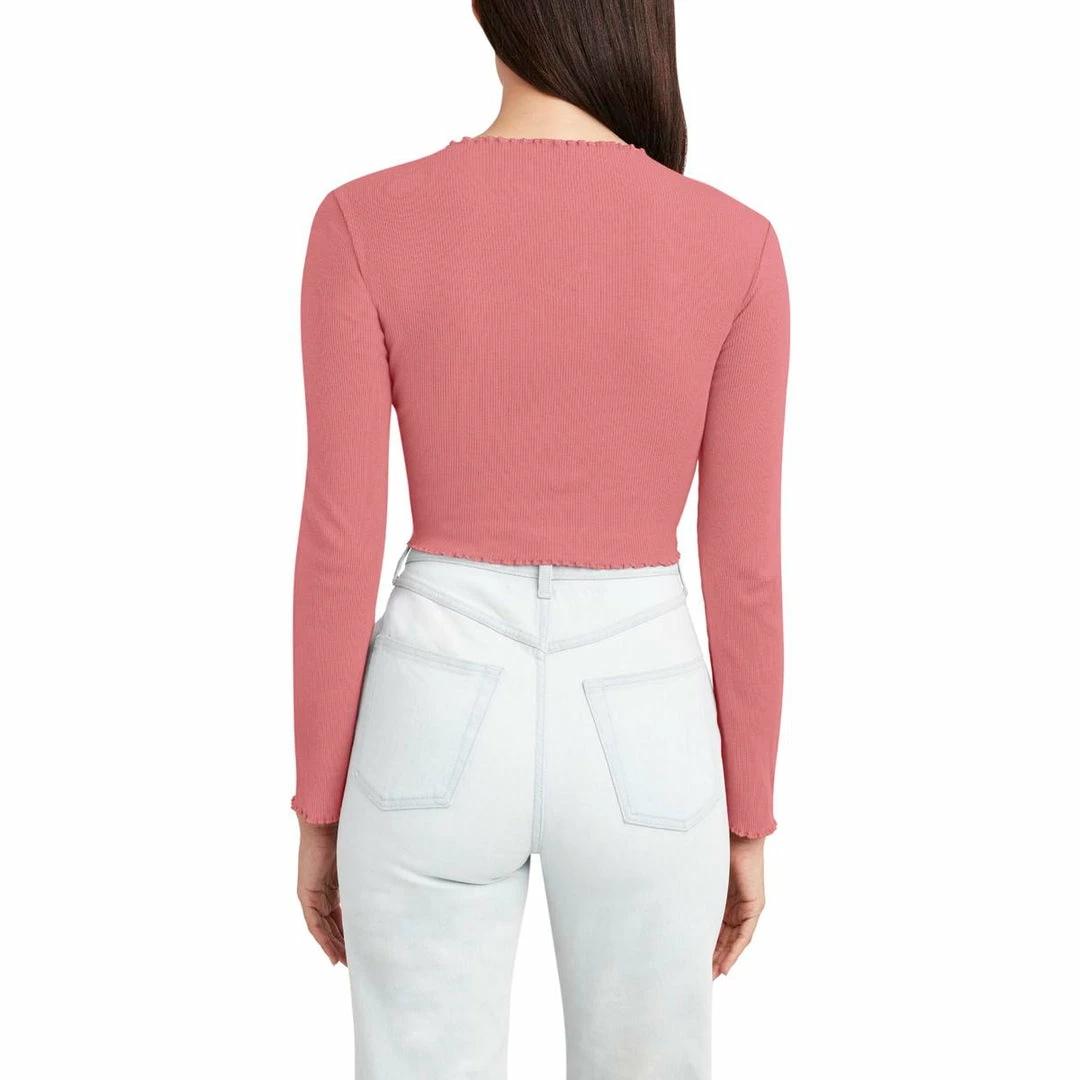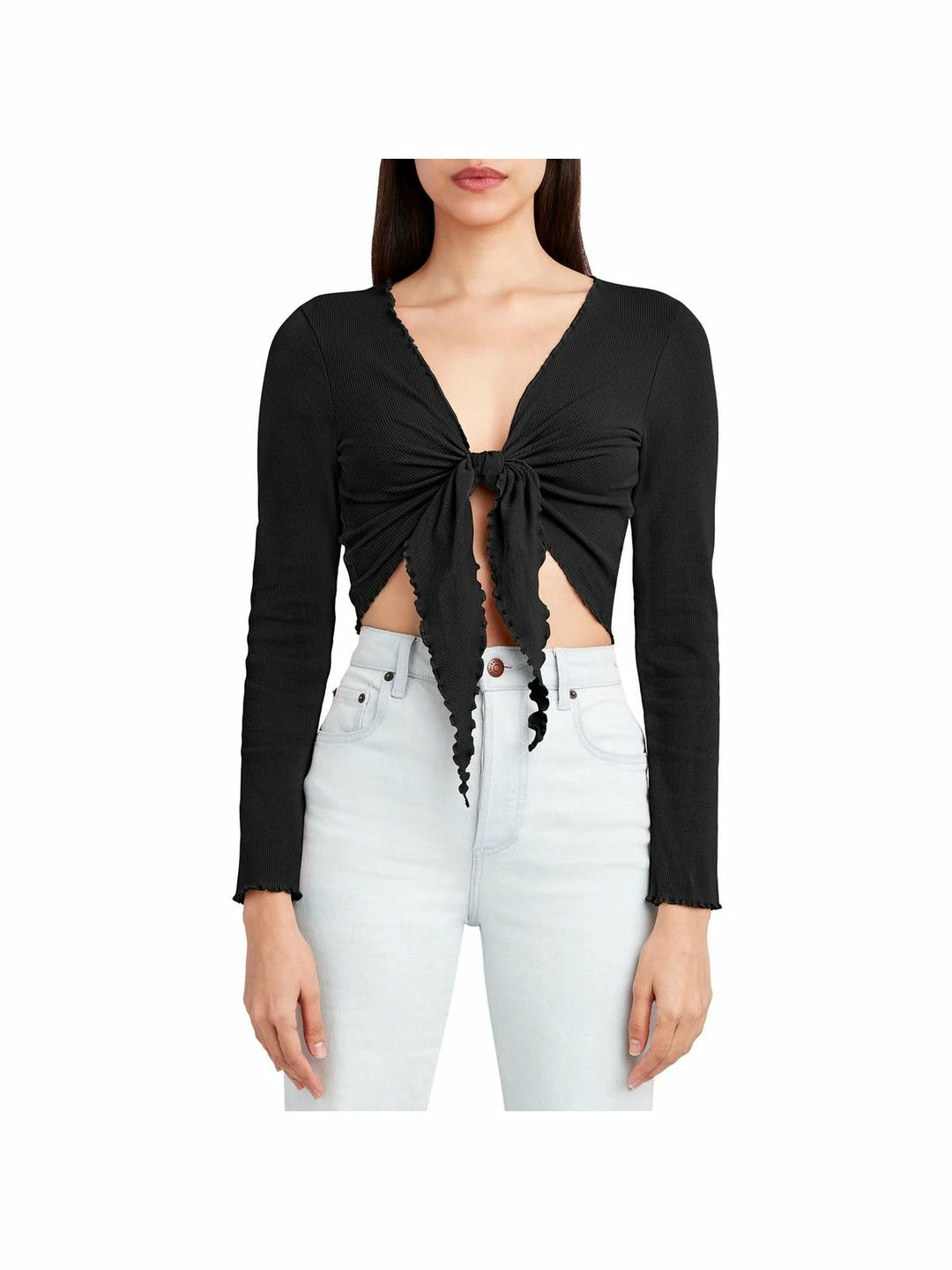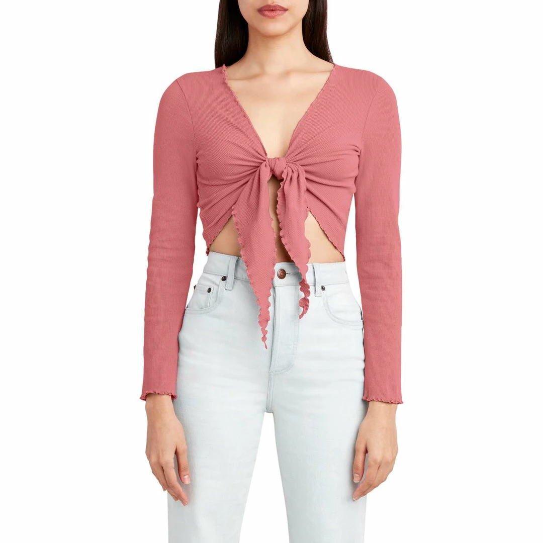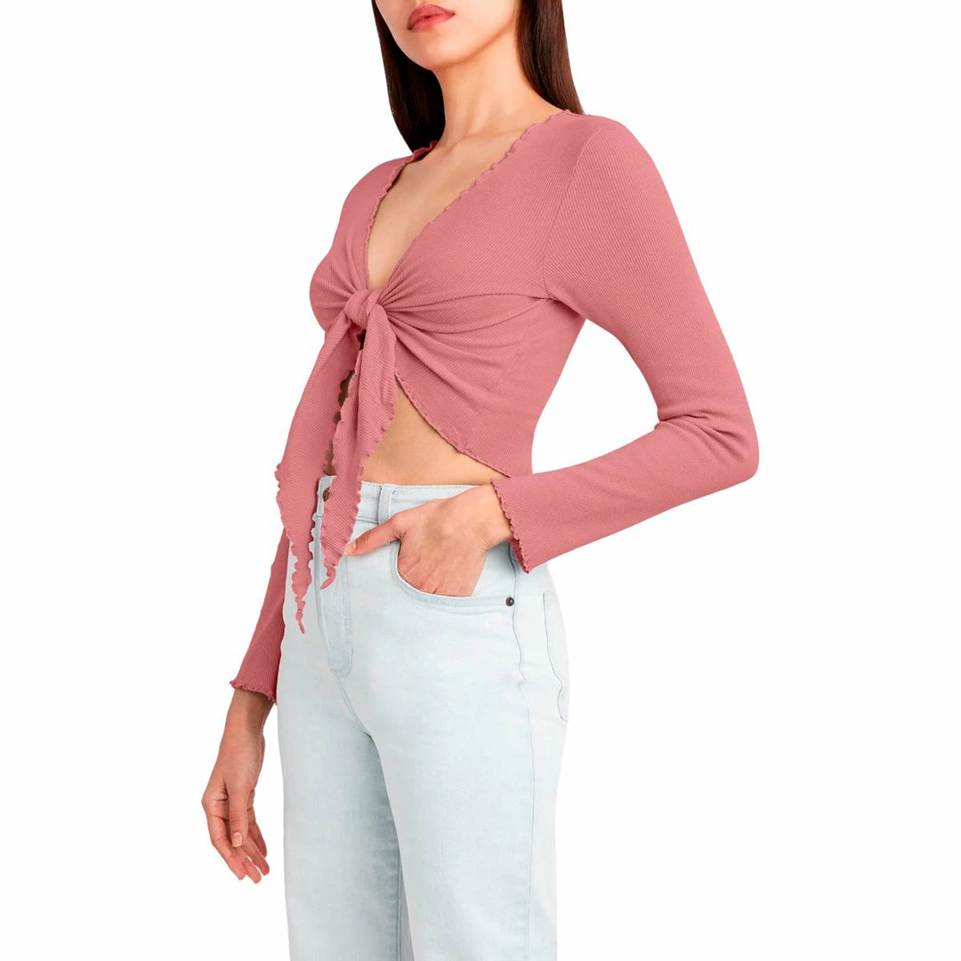 Be your best and make your weekends easy-going in this tie front top by BCBGeneration. Made of 57% Cotton, 38% Polyester, and 5% Spandex. Features front tie closure and long sleeve with lettuce trim detail. Machine washable.
