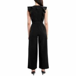 Elevate your look in this ruffled wide leg jumpsuit by BCBGMAXAZRIA. Crafted with 95% Polyester and 5% Spandex. The ruffled details and wide leg construction will make this a desk to dinner favorite! This jumpsuit features a slimming belted waist and a sexy V-Neck cut. Pair it with your favorite heels and accessories to complete your ensemble. Sleeveless. Concealed back zipper closure. This jumpsuit is guaranteed authentic.